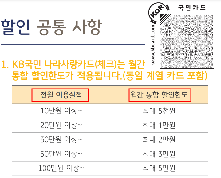 - 전월 이용 실적에 따라 할인 한도가 정해지고 큰 특징은 대중교통 요금할인, 통신요금 자동이체 할인 서비스는 할인 한도에서 제외 된다는 특징이 있다.
