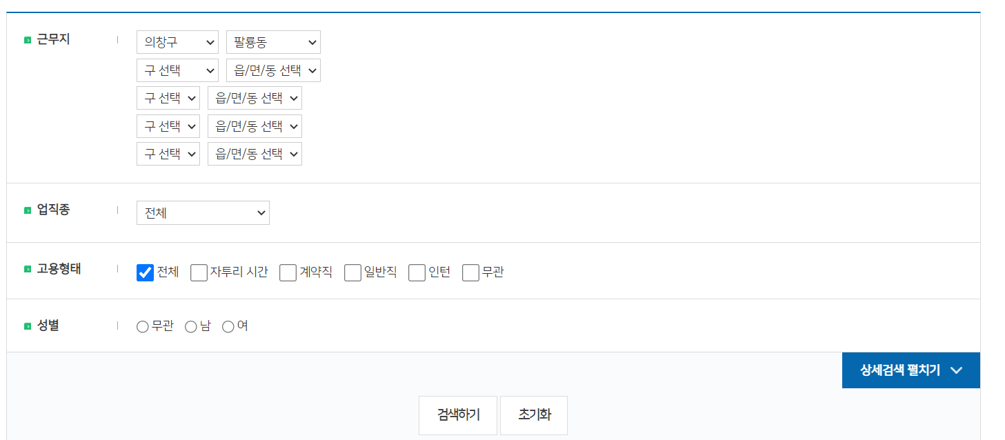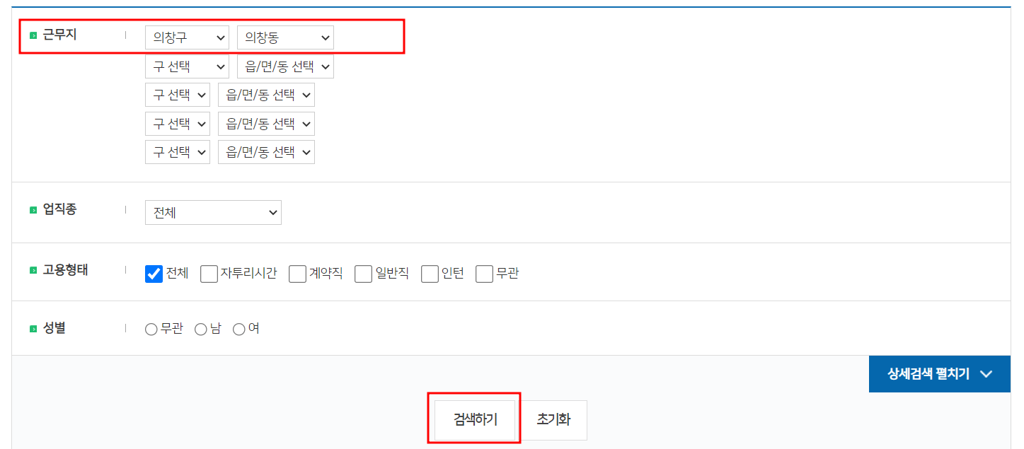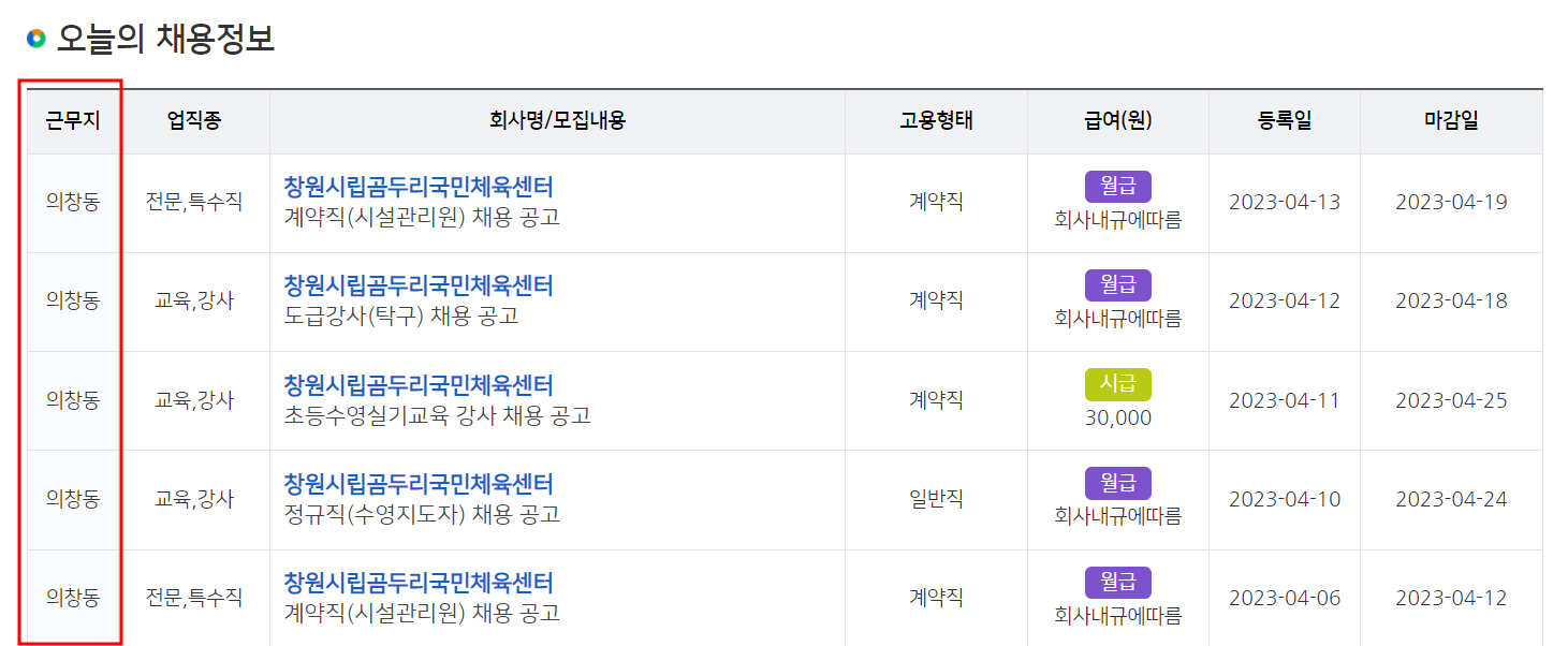 원하는 근무지 의창동에서 고용을 원하는 업체 정보가 나오고 있고 해당 회사명을 클릭하면 상세 모집 요강이 나옵니다.